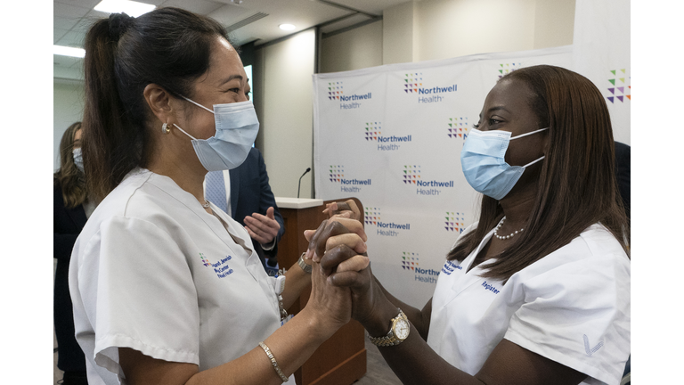 In the photo above, nurse Annabelle Jimenez, left, congratulates nurse Sandra Lindsay after she is inoculated with the COVID-19 vaccine, today, December 14, 2020 at the Jewish Medical Center, in the Queens borough of New York City.