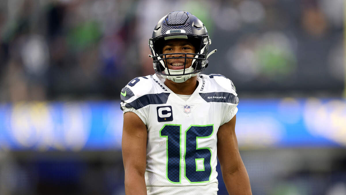 Tyler Lockett #16 of the Seattle Seahawks laughs during warm up before the game against the Los Angeles Rams at SoFi Stadium on December 04, 2022 in Inglewood, California. (Photo by Harry How/Getty Images)