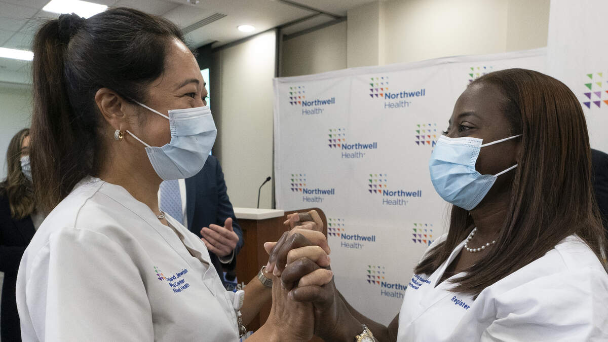 In the photo above, nurse Annabelle Jimenez, left, congratulates nurse Sandra Lindsay after she is inoculated with the COVID-19 vaccine, today, December 14, 2020 at the Jewish Medical Center, in the Queens borough of New York City.