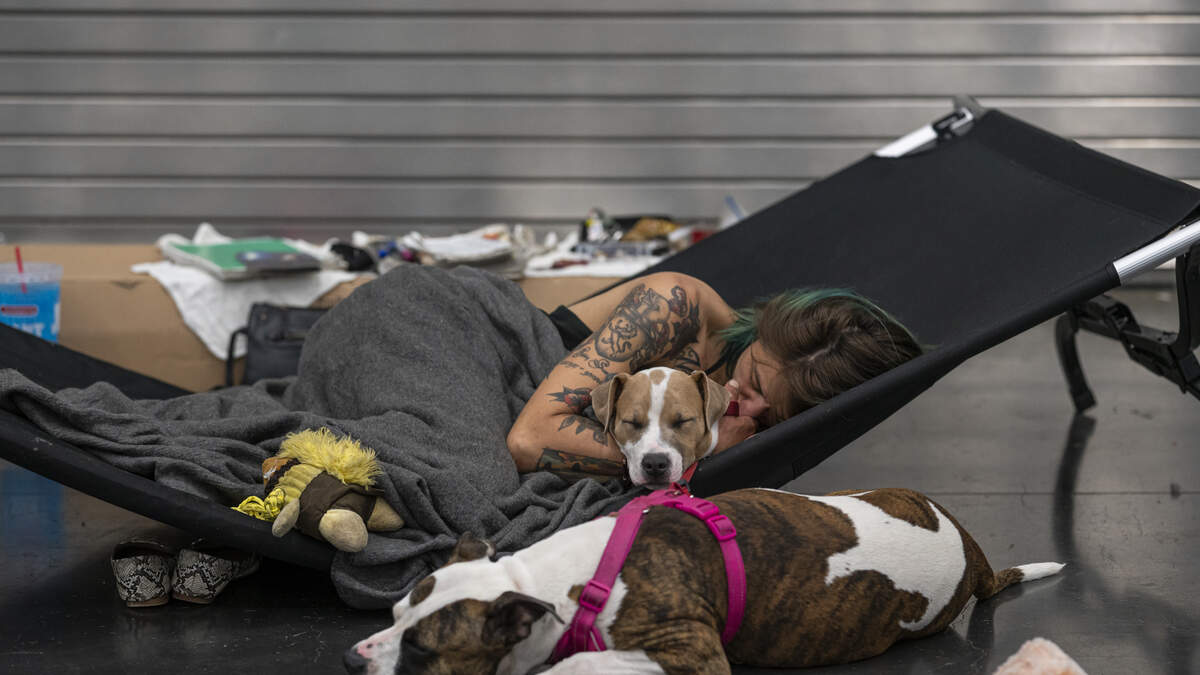 PORTLAND, OR - JUNE 27: Austun Wilde rests with her two dogs, Bird Is The Wurd and Fenrir at a cooling center in the Oregon Convention Center on June 27, 2021 in Portland, Oregon. Record breaking temperatures lingered over the Northwest during a historic heatwave this weekend. (Photo by Nathan Howard/Getty Images)Photo: Getty Images