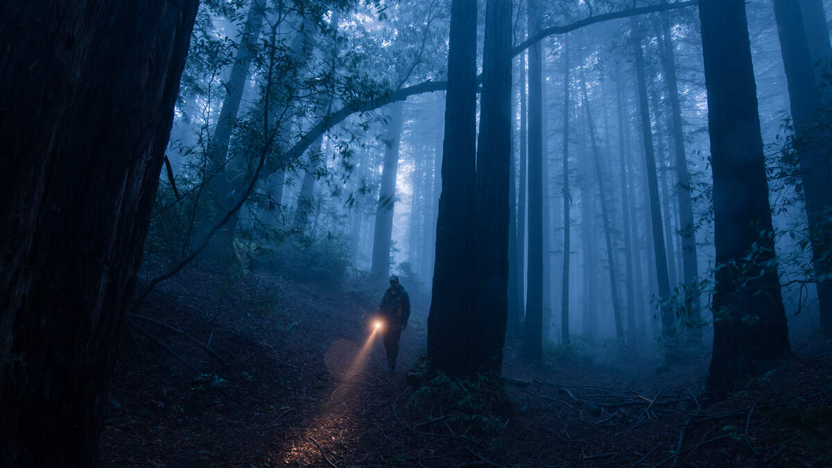 Man Holding Illuminated Flashlight By Trees In Forest