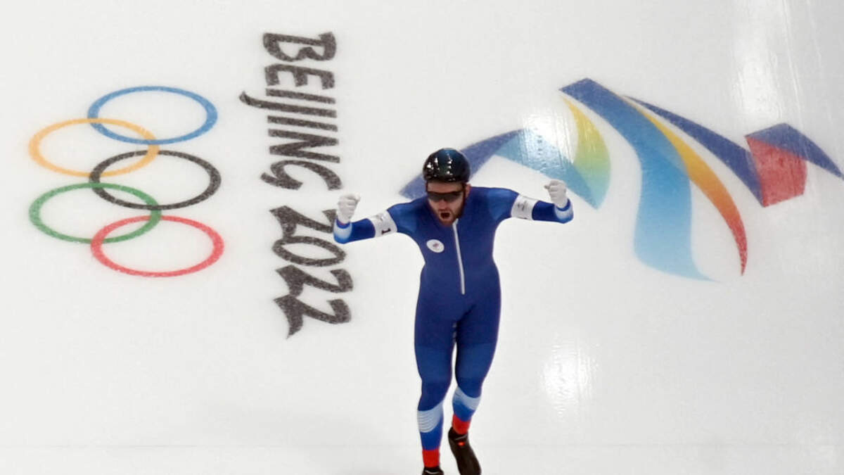 Russia's Daniil Aldoshkin reacts after competing in the men's speed skating team pursuit semifinal during the Beijing 2022 Winter Olympic Games February 15, 2022. (Photo by Sébastien Bozon/AFP) Photo: AFP