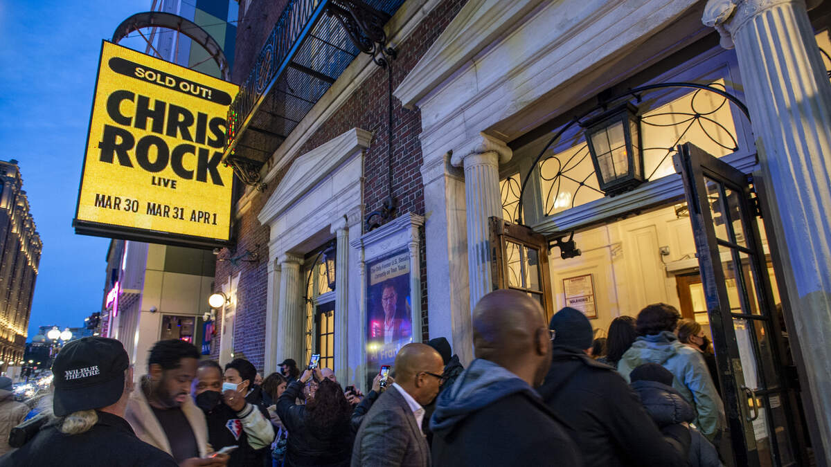 People enter the Wilbur Theatre for a sold out performance by US comedian Chris Rock in Boston, Massachusetts on March 30, 2022. - Rock has not spoken publicly since he was slapped by actor Will Smith during the telecast of the 94th Oscars ceremony on March 27. Ticketing site TickPick said on March 28 that it had sold more tickets for Rock's tour in the preceding 24 hours than in the whole previous month. (Photo by JOSEPH PREZIOSO/AFP via Getty Images)Photo: Getty Images