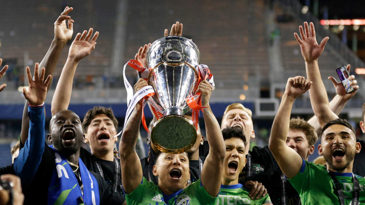 SEATTLE, WASHINGTON - MAY 04: The Seattle Sounders celebrate after beating Pumas 3-0 during 2022 Scotiabank Concacaf Champions League Final Leg 2 at Lumen Field on May 04, 2022 in Seattle, Washington. (Photo by Steph Chambers/Getty Images)Photo: Getty Images North America