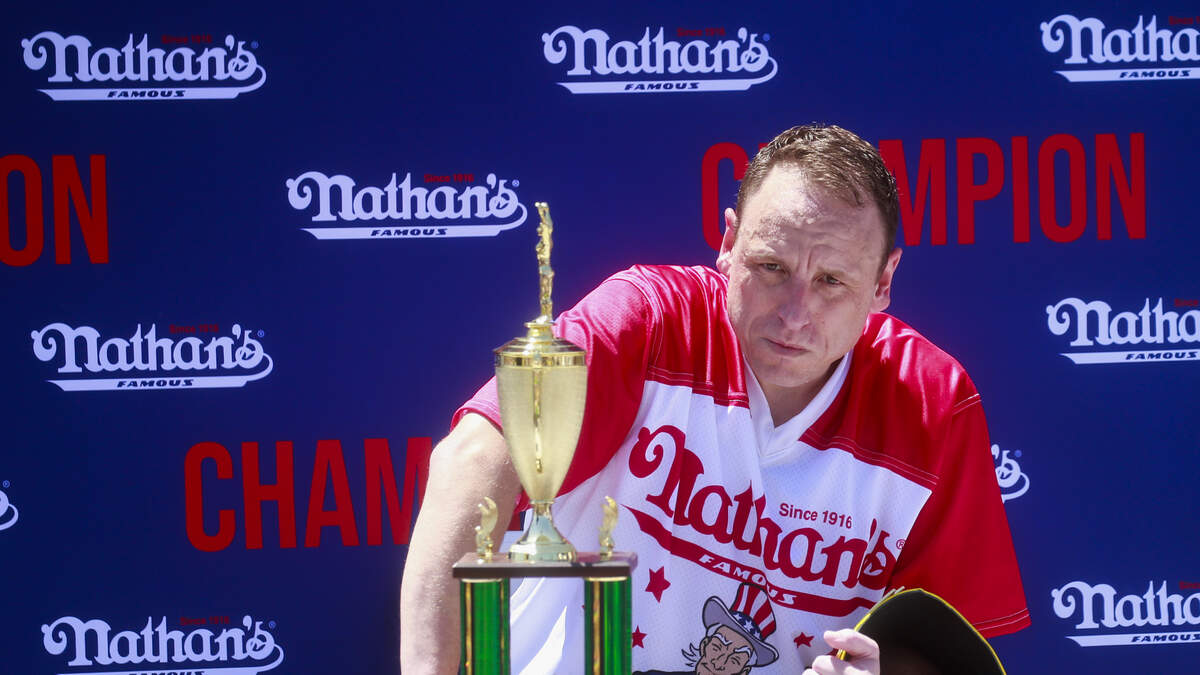 NEW YORK, NY - JULY 04: Joey Chestnut sits with the trophy and belt after he won first place, eating 63 hot dogs in 10 minutes, during the 2022 Nathan's Famous Fourth of July International Hot Dog Eating Contest on July 4, 2022 at Coney Island in the Brooklyn borough of New York City. The contest, which has happened every year since 1972, has returned in front of Nathan's Famous on Surf Avenue this year. (Photo by Kena Betancur/Getty Images)Photo: Getty Images