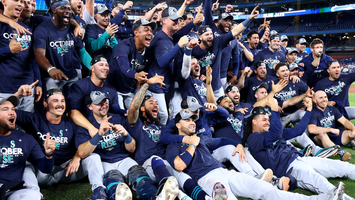 8 of 28 TORONTO, ONTARIO - OCTOBER 08: The Seattle Mariners celebrate after defeating the Toronto Blue Jays in game two to win the American League Wild Card Series at Rogers Centre on October 08, 2022 in Toronto, Ontario. The Seattle Mariners defeated the TorontoPhoto: Getty Images North America