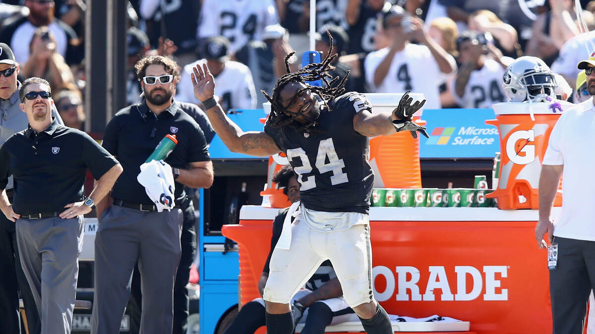 OAKLAND, CA - SEPTEMBER 17: Marshawn Lynch #24 of the Oakland Raiders dances on the sideline during their win over the New York Jets at Oakland-Alameda County Coliseum on September 17, 2017 in Oakland, California. (Photo by Ezra Shaw/Getty Images)Photo: Getty Images