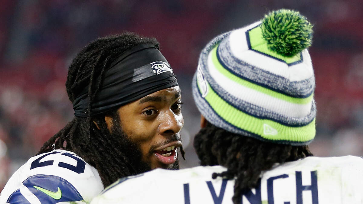 Cornerback Richard Sherman #25 (L) of the Seattle Seahawks talks with running back Marshawn Lynch #24 during the NFL game against the Arizona Cardinals at the University of Phoenix Stadium on December 21, 2014 in Glendale, Arizona. The Seahawks defeated the Cardinals 35-6. (Photo by Christian Petersen/Getty Images)Photo: Getty Images