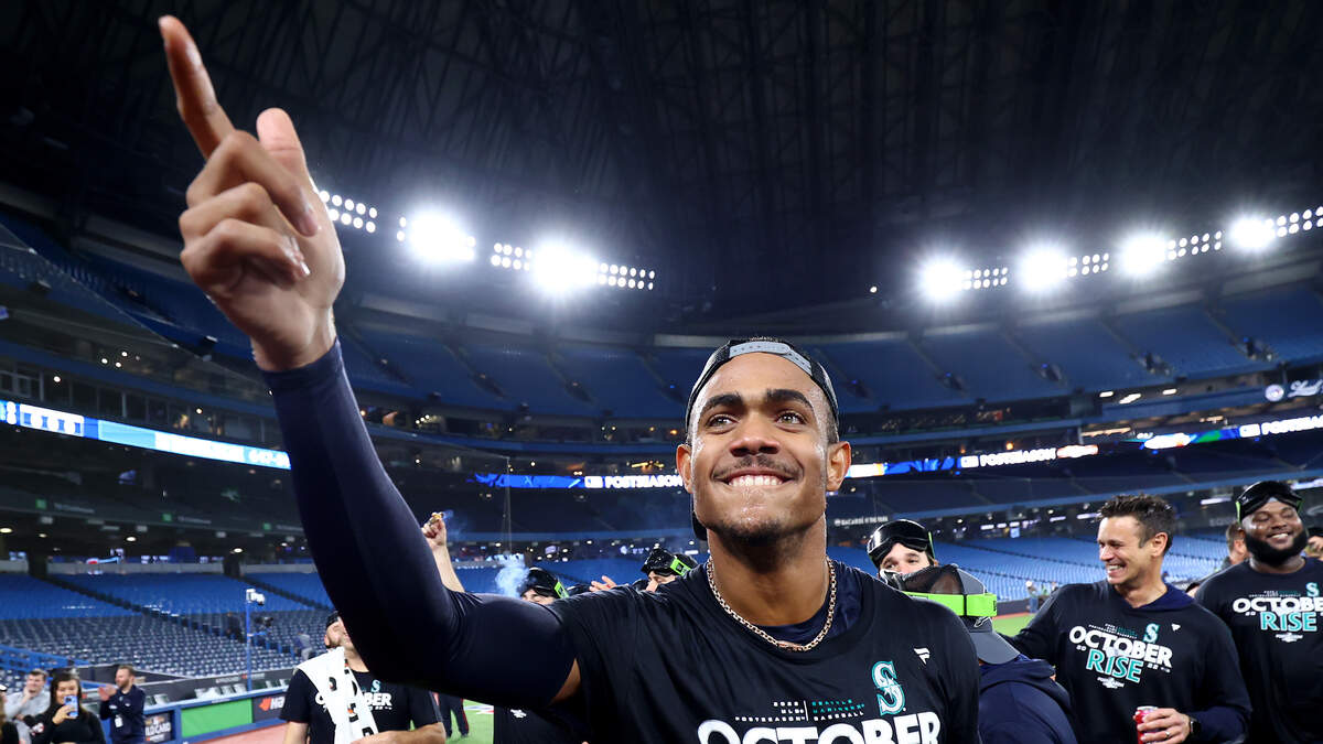 Julio Rodriguez #44 of the Seattle Mariners celebrates on the field after defeating the Toronto Blue Jays in game two to win the American League Wild Card Series at Rogers Centre on October 08, 2022 in Toronto, Ontario. (Photo by Vaughn Ridley/Getty Images)Photo: Getty Images