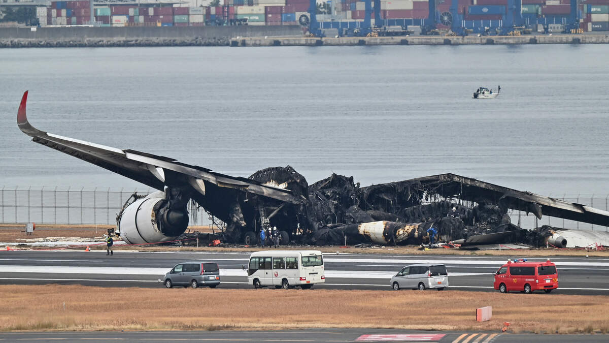 Officials look at the burnt wreckage of a Japan Airlines (JAL) passenger plane on the tarmac at Tokyo International Airport at Haneda in Tokyo on January 3, 2024, the morning after the JAL airliner hit a smaller coast guard plane on the ground. Five people aboard a Japan coast guard aircraft died on January 2 when it hit a Japan Airlines passenger plane on the ground in a fiery collision at Tokyo's Haneda airport. (Photo by Richard A. Brooks - AFP via Getty Images)Photo: RICHARD A. BROOKS / AFP / Getty Images