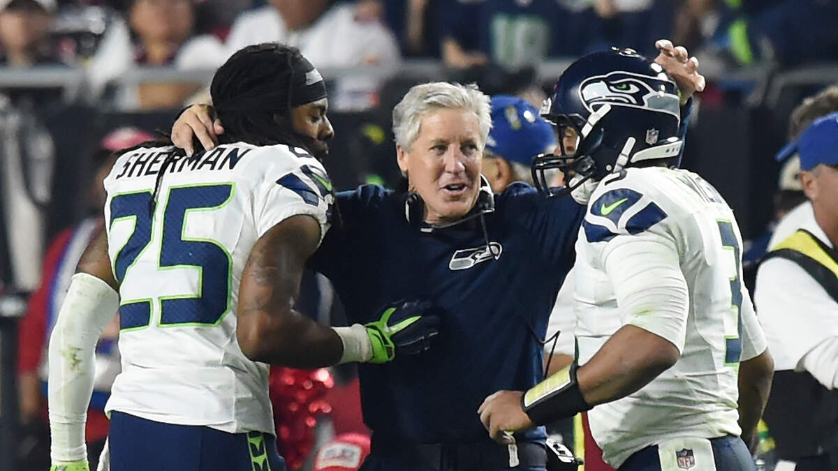 Head coach Pete Carroll of the Seattle Seahawks congratulates cornerback Richard Sherman #25 and quarterback Russell Wilson #3 after they scored the final touchdown of the game in the fourth quarter against the Arizona Cardinals at University of Phoenix Stadium on December 21, 2014 in Glendale, Arizona. The Seahawks won 35-6. (Norm Hall/Getty Images)Photo: Norm Hall / Getty Images Sport / Getty Images